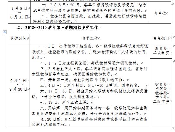 2017~2018学年第二学期教学工作即将结束,为了保证本学期各项教学工作顺利完成和下学期初教学工作正常运转,特制订《2017~2018学年第二学期期末和2018~2019学年第一学期期初教学工作安排》。经 6月6日校长办公会审定通过,现予以印发,请遵照执行。