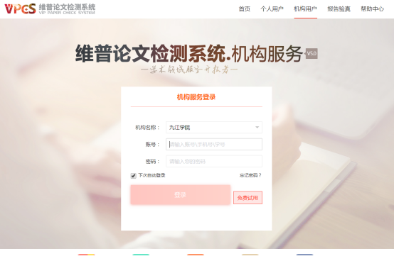 试用网址:维普资讯论文检测系统大学生版http://vpcs.cqvip-com/organ2018