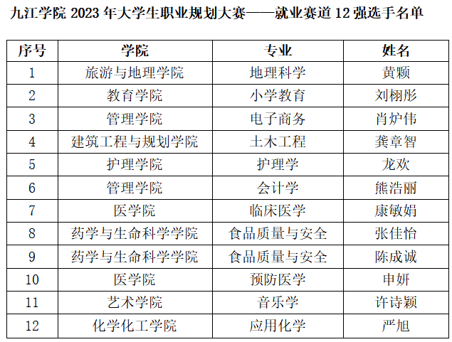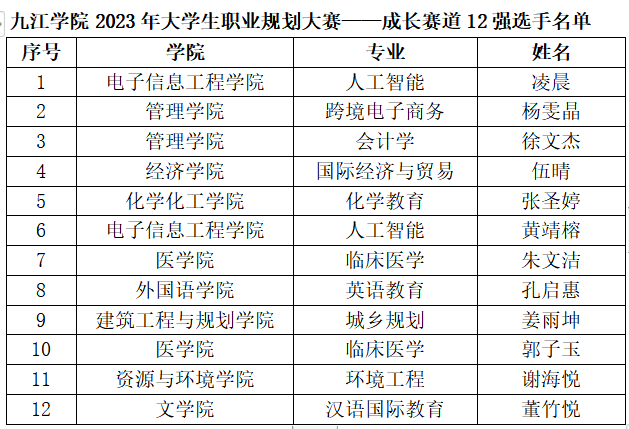 根据学校《关于举办九江学院2023年大学生职业规划大赛的通知》要求,经过个人申报和各二级学院初赛,参照省赛评分标准,校内专业教师和校外企业行业导师组成评审团对各学院推荐参赛选手的书面材料进行评选,确定各赛道前12名进入学校决赛,现将有关事项通知如下: