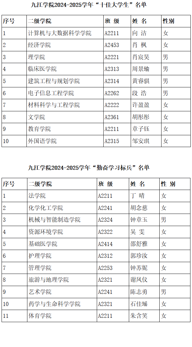 关于九江学院2024-2025学年“十佳大学生”“勤奋学习标兵”评选结果公示