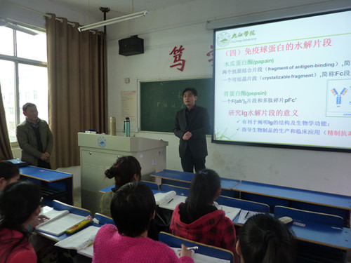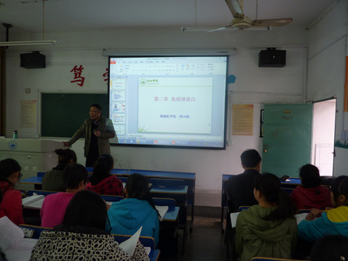 3月26日上午,副校长杨耀防来到浔东校区思贤楼506教室,与基础医学院口腔本科班的同学们一起,听了周小鸥老师的《免疫学》课程。基础医学院副院长郑美蓉一同听课。