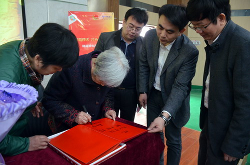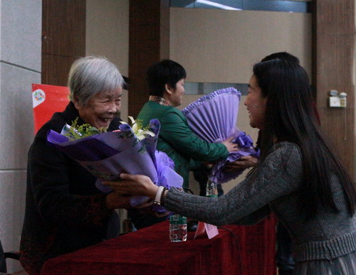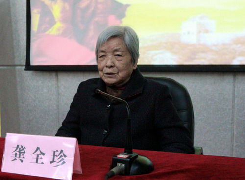 龚全珍做了讲话,她寄语广大青年学生信仰不能缺,艰苦奋斗的传统不能丢,要珍惜学习的机会,努力报效祖国。龚老还在签名簿上签下了“祝九江学院越办越好”的题词,希望家乡的大学为国家、为社会输送更多优秀人才。龚全珍老人恪守信念的高尚情操触动了每个人的灵魂。现场为龚老送上了持久热烈的掌声,全场观众在九江学院十佳歌手穆翘轩同学的带领下为我们最可爱的龚老献上了一曲《老阿姨》。