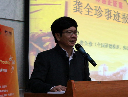 最后,副校长王万山做了讲话。王副校长高度肯定了龚老服务群众、一心为民的质朴情怀,忠于职守、矢志不渝的执着追求,艰苦奋斗、无私奉献的高尚情操。同时勉励广大同学以龚老为榜样,坚定理想信念,做中华民族传统美德的传承人和社会主义核心价值观的模范践行者,一个有理想、有信念、有爱心、有乡情的人,为实现中华民族伟大复兴的中国梦奉献力量。
