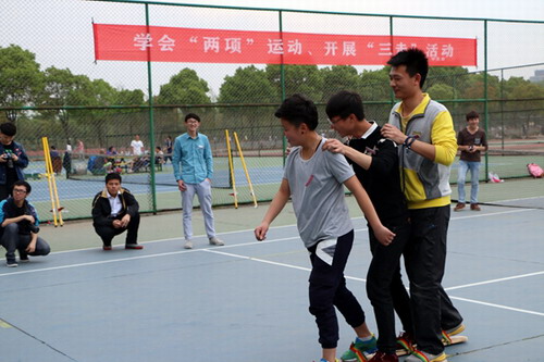 在室外网球场,大骨班学员正在开展“学会两项运动·开展三走活动”主题特色活动。汤瑞琪副主任、朱汉浩副主席、王万山副校长、校纪委魏立平书记、团市委宋晓妤书记等在学生处、校团委负责同志的陪同下,来到活动现场,观看同学们“三走”活动。