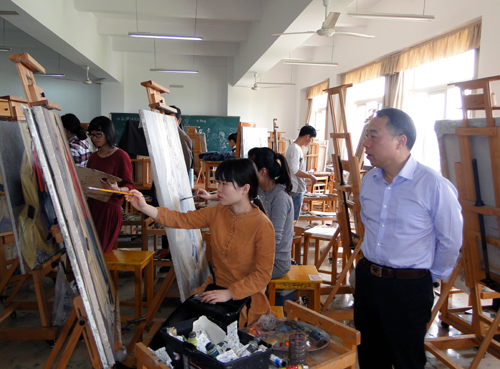随后,甘校长又走进厚德楼448教室,观看了艺术学院A1212班的同学们正在进行的油画写生课。