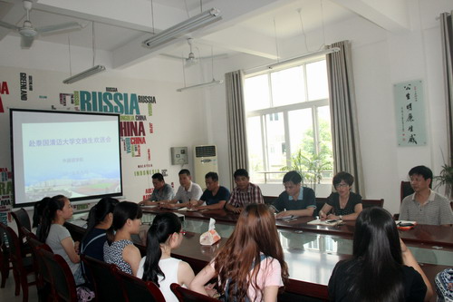 6月25日下午,学校在香远楼外国语学院219会议室举行赴泰国清迈大学交换生欢送会,副校长杨耀防出席会议并讲话,外语副院长柴克清、国际交流处副处长王贤淼、外国语学院党委副书记彭晓以及职能科室、专业教研室负责人与赴泰学生参加,韩琨院长主持欢送会。