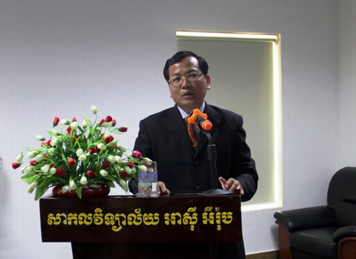 7月22日,由柬埔寨王家研究院孔子学院主办,亚欧大学承办的“酒店及旅游管理培训班”结业典礼在金边亚欧大学金色大楼会议室举行。柬埔寨旅游部国务秘书(副部长)斯当索坤阁下(H.E. SDEUNG SOKHOM),中国驻柬埔寨大使馆二等秘书韩静女士,柬埔寨王家研究院孔子学院院长谢莫尼勒阁下(H.E.CHEA MUNYRITH)、中方院长帅式毅,九江学院选派的培训教师王丽霞、李翔宇,亚欧大学校长谢索皮博士(CHEA SOPHEAP)、各学院负责人、中文系全体公派教师及汉语教师志愿者及经济及旅游管理学院全体学生参加了结业典礼。