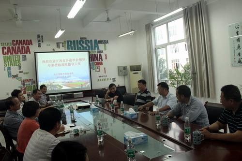 9月23日下午,江西省外语学会名誉会长陈绵水教授、会长况新华教授、学会书记廖洪中教授、秘书长于洪颖教授等一行6人,到永利yl23411集团官网就2015年外语学会学术年会与大学外语教学研究会年会的筹备等工作进行指导。省英语学会领导一行考察了校园环境、年会会场、接待宾馆等,并开展了座谈调研。永利yl23411集团官网陶春元副校长、教务处马明亮处长陪同调研,韩琨主持了调研座谈会。外国语学院党政领导、职能科室参加了汇报和座谈。