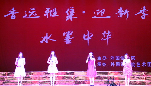 迎新晚会在香远雅集艺术团开场舞中拉开了序幕,主持人用中、英、日三种语言介绍了晚会,充分展现了外国语学院的专业特色。整场晚会围绕葱茏九院、水墨中华、炫彩世界三大主线展开,分别从不同角度展现了外院学子的风采。