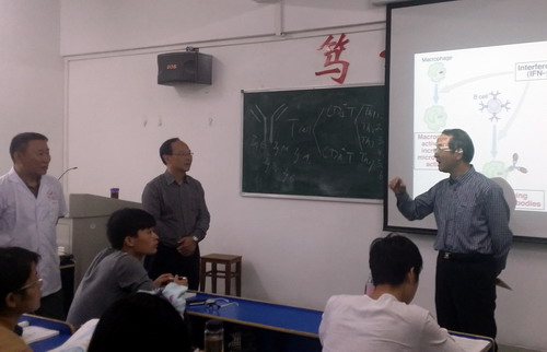 课堂上,周小鸥老师首先从我国第一个自然科学领域诺贝尔得奖女科学家屠呦呦和清华大学副校长、生物学家施一公事迹,引入本节课内容,生动的讲解了细胞因子的发展过程、分类及特性。授课过程中,周小鸥老师不时走下讲台与同学们互动,课堂气氛活跃。陶副校长在课堂上聚精会神,认真地做着笔记。