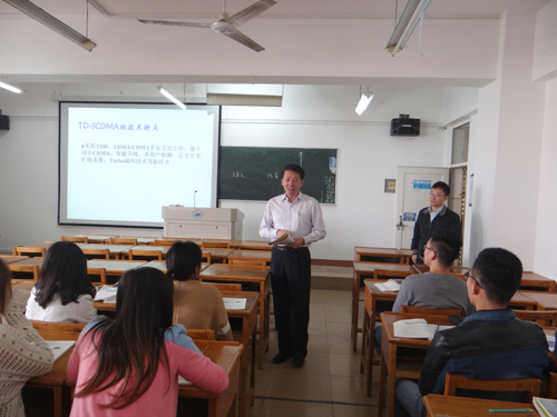 在竞知楼804教室,郑书记随堂听取了电子学院杨世永博士为电子学院A1221、A1222班讲授的《3G移动通信理论及应用》课程。课堂上,杨博士讲授了FDMA、TDMA、CDMA等多址技术,着重介绍了TD-SCDMA多址技术标准的发展历程和技术特点。杨博士结合交通案例讲解知识重点,令同学们更易于理解。同学们始终聚精会神听讲,积极回答杨老师提出的问题。