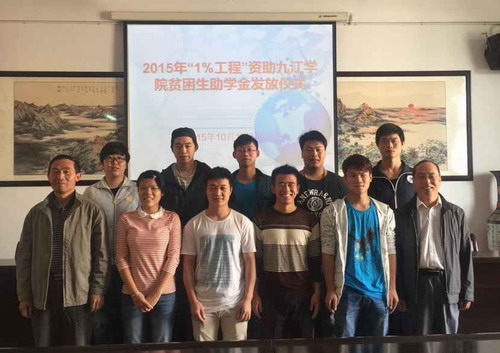 10月13日上午, 2015年度“1%工程”资助九江学院贫困学生助学金发放仪式在永利yl23411集团官网厚德楼415会议室举行。校学生资助管理中心主任潘建华,民进九江市委会副主委、九江学院总支主委赵追和本次受到资助的学生出席发放仪式。