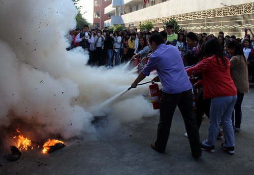 防震演练后,保卫处刘老师为大家讲解了消防器材的使用方法及防火措施,同学们认真观看、仔细聆听。随后,一部分同学拿起灭火器在保卫处老师的指导下,以正确的步骤和方法对模拟起火部位展开灭火,大火迅速被扑灭。