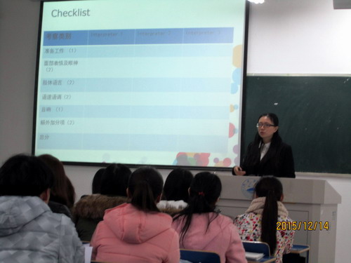 赵宋文老师采用PPT方式,讲授了“Public  Speaking”内容。她通过实际案例,说明了对于口译者来说公共演讲技巧的重要性,影响公共演讲的因素,以及如何克服怯场等;通过分组方式,让学生到讲台上实际操练新闻播报,天气预报,公司产品介绍,开幕式讲话等内容,让其他学生充当评委,然后讨论各组的优点和不足。课堂上师生互动频繁,气氛活跃,很好地激发了学生学习兴趣,培养其合作精神和竞争意识。
