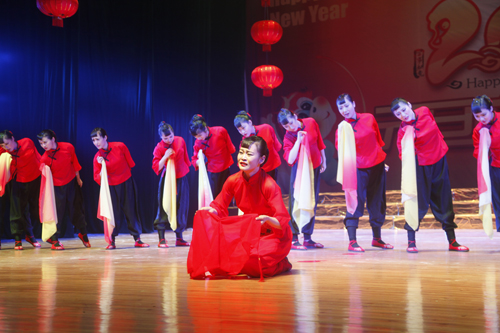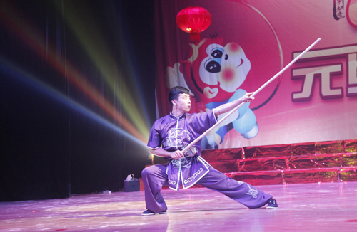 晚会在体育学院带来的龙狮表演《龙狮闹春》中拉开序幕。体育学院龙狮队一出场就气势不凡,一条龙狮摇头摆尾,两只威猛的狮子前蹦后跳,队员们随着音乐的节奏上下穿行,时而腾空,时而俯冲,精美的造型,惊险的动作,赢得了在场观众的一片喝彩。