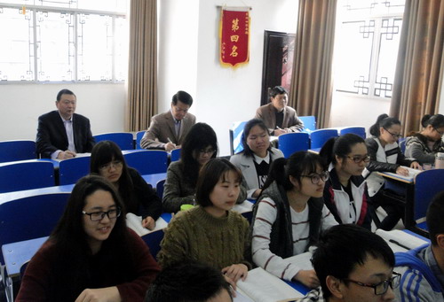 4月1日上午第二节课,校党委书记郑翔来到浔东校区华文楼101教室,随机听取了护理学院汪小燕副教授为护理A1411/A1412班同学讲授的《健康评估》课程中“感觉功能检查和神经反射检查”一节内容。教务处长马明亮,护理学院院长王绍锋、党委书记丁蓉等一同听课。