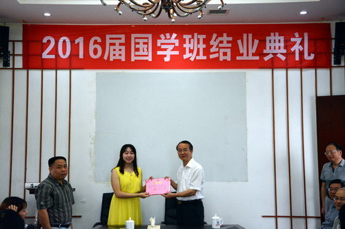 2016届国学班班主任曹欢荣博士阐释了国学班的价值和追求,以及在教学上的探寻和感悟,并宣读了结业学员的名单。