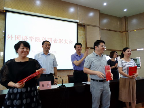杨杰书记宣读表彰决定,授予周志高、吴群、王沅芬老师为外国语学院科研标兵称号。同时,希望广大教职员工认真领会落实郑翔书记关于科研工作的指示精神,以受表彰的个人为榜样,扎实工作、勇于创新,为推动我院各项工作再上一个新的台阶做出更大的贡献。科研标兵代表周志高、吴群上台发言,与大家分享科研的经验和体会。