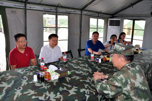 武警二总队副政委熊壮中和政治部副主任张宗金热情接待了民盟慰问团一行。他们介绍了当前九江抗洪救灾的严峻形势和艰巨任务,讲解了多个军民联合抗洪感人故事,并表示对打赢抗洪抢险这场战争充满信心,对我们浓浓的军民鱼水情表达了深深的谢意。