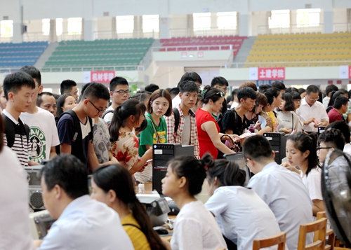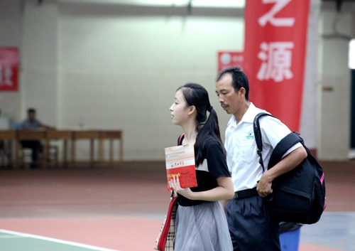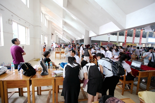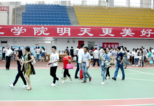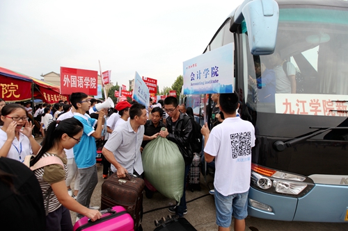 上午7:30开始,接新生的校车一辆接一辆抵达校室内田径馆新生报到处,大约每5分钟就有一班从火车站和汽车站迎新归来的校车。而负责接待的志愿者早已翘首等待在迎新总站的门口,用他们最直接最热情的方式迎接着每一位奔赴九江学院求学的学弟学妹们。总是可以看到每批校车抵达之际,热情的志愿者高举各院标志牌,沿着车窗高呼自己院系的名字,热切接待着来自祖国各地的学弟学妹们。
