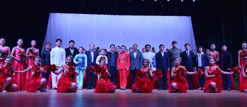 演出结束后,学校领导及嘉宾上台与演出人员一一握手并合影留念。