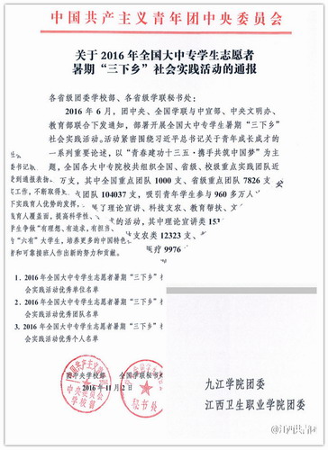 校团委被授予2016年全国大中专学生志愿者暑期“三下乡”社会实践活动优秀单位,九江学院长江水资源保护项目获得2016年大中专学生“三下乡”社会实践“千校千项”最具影响好项目;会计学院“青春助力红色修水”团队关于加大农村电商发展扶持力度的建议E议案获得2016年大中专学生“三下乡”社会实践“千校千项”百佳模拟提案入选项目;药生学院周昊、会计学院张志勇、临床医学院黄海泉等三名同学入选2016年大中专学生“三下乡”社会实践“千校千项”实践组织带头人名单。