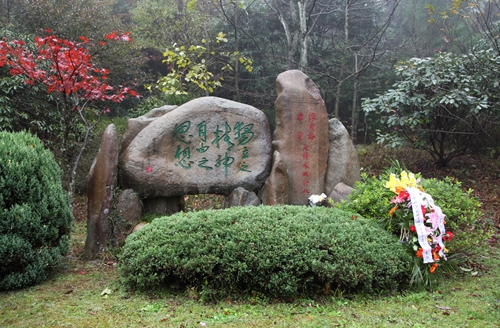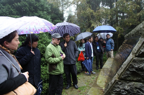 11月8日上午,与会全体代表来到庐山植物园,在陈寅恪夫妇墓前举行了简短的凭吊仪式。会议代表与陈氏家属敬献了鲜花,全体参会嘉宾向陈寅恪夫妇行三鞠躬礼。郑翔书记向与会代表讲述了当年促成陈寅恪、唐筼夫妇归葬庐山的事件经过。陈寅恪先生及夫人唐筼1969年逝世后,骨灰一直寄存公墓。“文革”结束后,陈寅恪女儿历尽努力,希望能完成父亲归葬杭州祖墓或庐山陈氏故居松门别墅旁的遗愿,然而由于种种原因未能如愿。2003年,时任庐山植物园主任、党委书记的郑翔在得知此事后,多方热心奔走,几经努力,在庐山植物园建“景寅山”,并最终促成陈寅恪夫妇顺利安葬植物园。11月9日上午,与会部分代表还将赴修水参观陈家大屋,进一步考察陈氏文化。