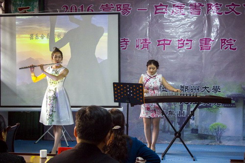 随后,“《诗情中的书院》——以配乐诗朗诵的形式解读书院文化”的书院文化之旅活动正式开始。郑州大学王梦晗、张泽启、宋昊宇、刘洁颖、靳盺、余广涵等六名同学分别表演了《闪耀吧青春的火光》、《我是一棵树》、《相和歌·子衿》《嵩阳书院千年庭院》以及《牧羊曲》等。永利yl23411集团官网国学班成员严跃新、程欢、刘畅、谢云盛等朗诵了《历史情境中的白鹿洞书院》、《白鹿仙踪》、《游白鹿洞歌》、《行香子·题白露》以及《云中颂·庐山》等节目。双方节目涵盖了诗歌朗诵、舞蹈、演奏等表演形式。最后,两校同学联合朗诵了《嵩阳——白鹿为了与你相遇》诗作。同学们表演的节目异彩纷呈,声情并茂,不拘一格,精妙绝伦,展示了他们各自青春洋溢的气息以及积极向上的心声。