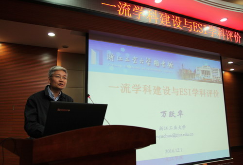 12月1日,应永利yl23411集团官网图书馆工作委员会邀请,浙江工业大学图书馆研究馆员、汤森路透中国高级顾问万跃华来校做了题为《一流学科建设与ESI学科评价》的学术报告。校党委书记郑翔,副校长王万山、陶春元,学校各职能部门主要负责人、二级学院院长,主管学科、科研的副院长,学科带头人及学术骨干等100多人参加了报告会。报告会由副校长王万山主持。
