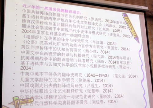 会议第二阶段,蒋平教授作了题为《国内翻译发展现状》的学术报告,蒋教授主要为大家介绍了国内翻译人才培养、翻译教育发展、翻译证书发展、翻译研究与学术文库外译国家战略、翻译技术发展等。通过聆听学术报告,与会代表们对计算机辅助翻译实验室系统,百度、谷歌等新科技革命和翻译发展趋势有了更深的理解,受益匪浅。