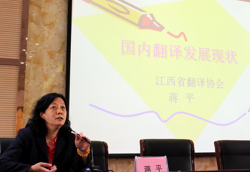 江西省翻译协会常务副会长兼秘书长蒋平教授致辞中,介绍了省译协的基本经验,指出要团结协作,提升业务能力,尤其要与时俱进,紧跟翻译技术的发展。