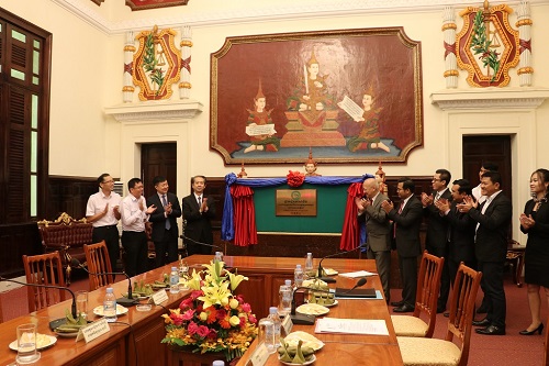 随后,熊波大使和昂翁瓦塔纳部长在与会嘉宾的见证下,共同为柬埔寨王家研究院孔子学院柬埔寨司法部汉语中心揭牌。