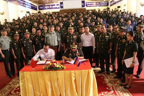 随后,柬埔寨孔子学院中方院长夏修龙和柬埔寨国防部军队民事事务局局长桑萨仁代表双方签订了合作协议。在全体与会人员的见证下,晋翁副部长和李宁亚武官共同为柬埔寨孔子学院国防部汉语中心揭牌。
