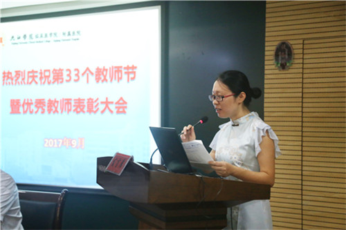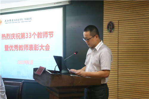 李苏琴副部长宣读了《关于表彰2016-2017学年优秀教师、优秀教育工作者、优秀辅导员、优秀班主任和先进集体的通报》,临床医学院/附属医院神经内科教研室获先进集体荣誉称号,刘云建、王彬、吴炳东、陈绪龙、谢福生等5人获优秀教师荣誉称号,蔡锦芳获优秀教育工作者称号,肖南、燕碧波2人获优秀班主任荣誉称号。校领导和临床医学院/附属医院领导分别为先进个人和先进集体颁发了荣誉证书和牌匾。王彬和肖南作为代表分别进行了发言。