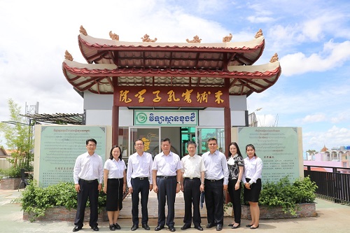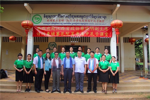 代表团一行还访问了柬埔寨孔子学院吴哥高中孔子课堂,受到暹粒省教育厅厅长苏提亚翁(SOY TITYAVONG)、副厅长李邦纳(LY BONA)和孔子课堂全体老师的欢迎。蔡副主席与孔子课堂的全体老师进行了座谈,他向教师们表示了慰问,对志愿者教师们甘于奉献、敢于挑战的精神表示钦佩。