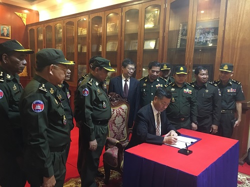 在孔子学院金边警备旅孔子课堂访问期间,受到警备旅司令毛树潘上将的盛情接待。毛将军介绍了警备旅和孔子课堂的基本情况,希望江西省给予孔子课堂支持和帮助。蔡晓明副主席对警备旅的热情接待表示感谢,他盛赞金边警备旅为“威武之师,友谊之旅”。蔡晓明鼓励警备旅的官兵到中国学习、交流和访问,希望通过增进双方的交流,以进一步促进中柬两国人民之间的相互了解。