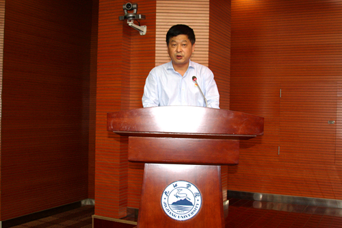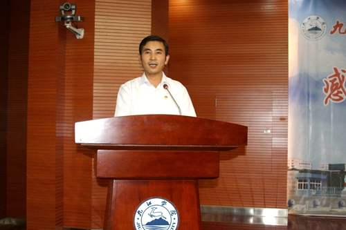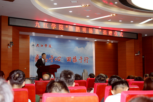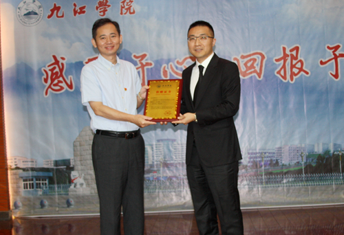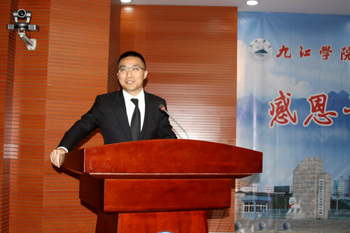 校党委副书记魏立平发表了热情洋溢的讲话。他说,今天我们在这里举行一个特别的仪式,既是感谢,也是纪念,更是激励。以往活动的主体多是教师和干部,今天主要是朝气蓬勃的同学。因为我们今天欢迎的尊贵客人,也曾是我们九江学院的一名学生,如今创造辉煌的他,不忘母校,不忘师恩,捐资200万元在母校设立“浩鹏明德奖”,褒奖在教书育人中表现突出的教职员工、褒奖发愤图强努力成才的学弟学妹,他就是原2001级中文专业学生、现上海中云资产管理有限公司董事长毛浩鹏校友!我们今天接受的是财富,永远致敬的是精神。