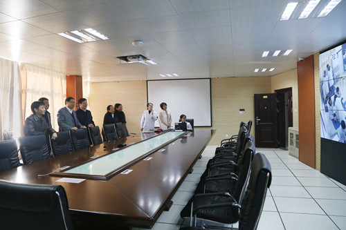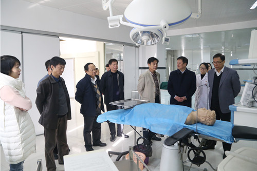 曹麒一行来到临床医学院/附属医院临床技能中心,先后到一教八楼在建的消化内镜研究室,二教的模拟病房、模拟产房、影像诊断实验室、中央监控室、模拟手术等地走访视察。张院长对该院的基本情况及临床技能中心的功能布局、设备设施、培训制度等进行了介绍,工作人员对各种模拟机器人进行了详细的讲解。曹书记兴致勃勃地耐心听取讲解,并不时提问了解情况,对该院高端的培训设施和先进的影像诊断技术赞叹不已。
