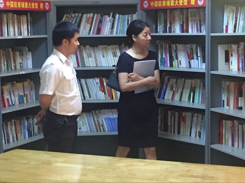 在参观由大使馆捐助的亚欧大学图书馆时,左文星参赞表示,如果亚欧大学有需要的话,使馆将继续捐赠一批新的中文图书,以满足柬埔寨汉语学习者日益增长的汉语学习需求,不断丰富汉语知识。(马剑/文/摄)