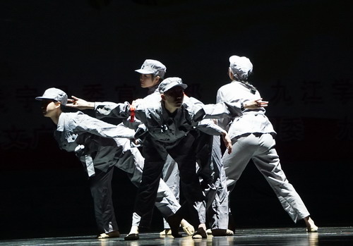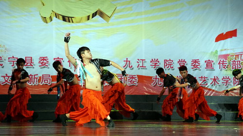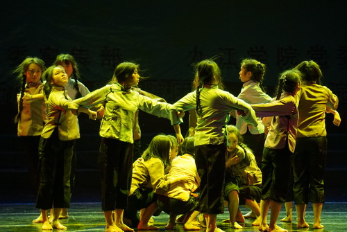 由武宁县职业中专学生们表演的舞蹈《活着1937》,讲述了抗日战争时期一群普通的中国女性用生命与敌人抗争的故事,“她们是23个中国女人,有孩子和学生,也有农妇和母亲。她们是战场外的牺牲品,或在挣扎中死去,或在抗争中存活。但是,她们是中国人,即使备受摧残,她们仍在用生命与敌人抗争,誓死托起襁褓里的婴孩……”灯,暗了,她们倒下死去;灯,亮了,她们挣扎爬起,抬头微笑……通过这场舞蹈,挖掘人性深度,告诉人们要“有尊严地活着”,更要“活出真实的自己”。