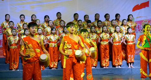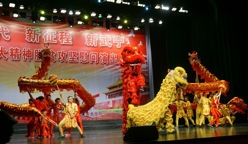 由武宁县第五小学一群活泼可爱的学生表演的国家非物质文化遗产——打鼓歌《山水武宁美名扬》拉开了本次慰问演出的序幕。武宁县素有“打鼓歌之乡”的美誉,其中最为耀眼的是被称为“武宁打鼓歌”的民间艺术。作为省级非物质文化遗产重点保护名录的武宁打鼓歌历史悠久、风味独特,是极为少见的民间艺术瑰宝,在当地流传了两百多年。小演员们的演唱和表演气氛热烈,充满激情,震撼人心。本次慰问演出共设诗朗诵、歌伴舞、独唱、歌曲联唱、健美操、器乐演奏及群舞类节目16个。