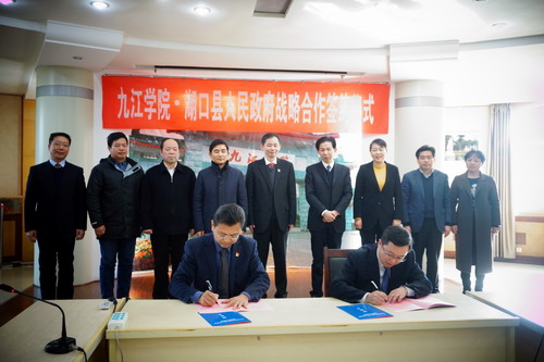 在热烈的掌声中,九江学院校长刘晓东和湖口县县长鲍成庚在九江学院与湖口县人民政府举行战略合作协议书上签字。