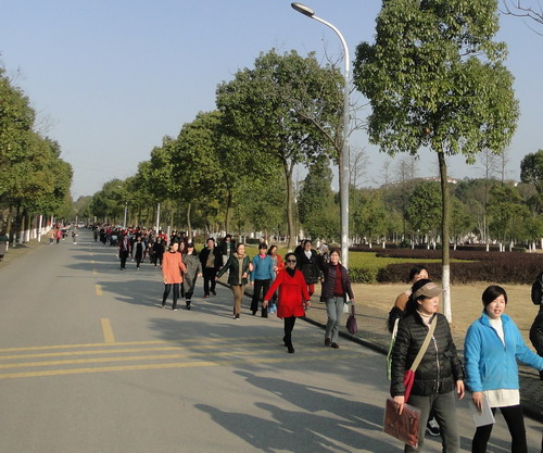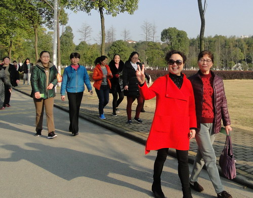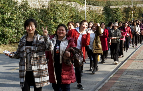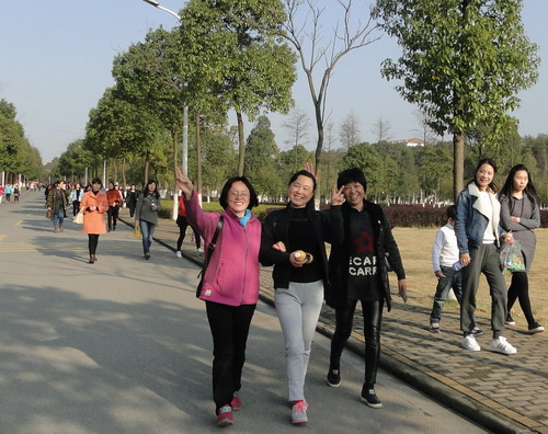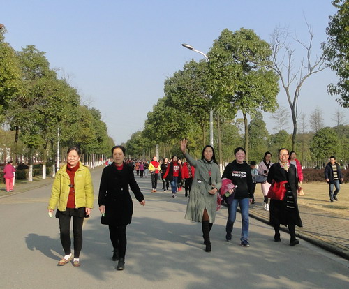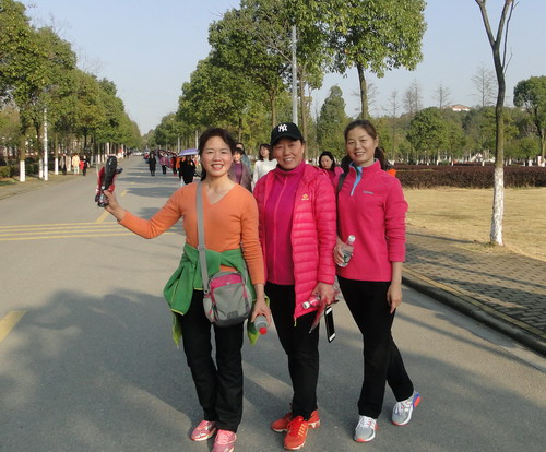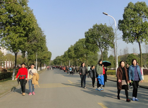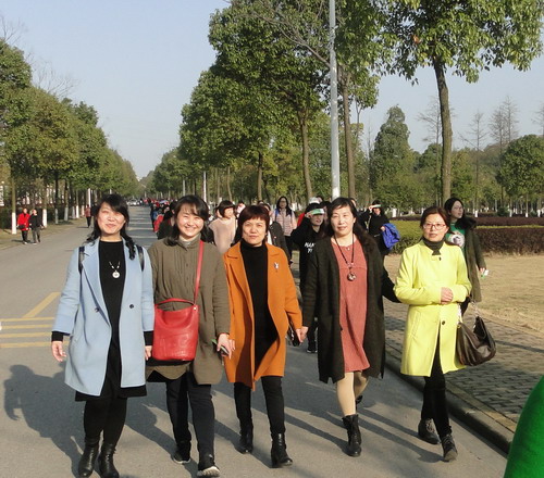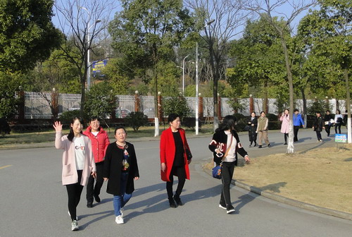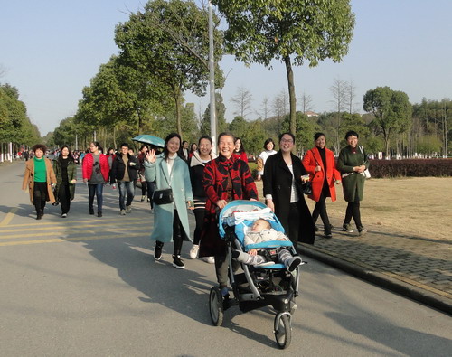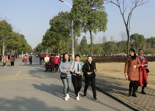 在明媚的春光中,700多名女教职工健走队伍浩浩荡荡沿着校园环行。矫健的身影为校园增添了一道亮丽的风景线,她们带着愉快的心情享受着春天的美景。健走途中,有的快步走,有的人结伴而行、有说有笑,还有的推着婴儿车慢走……大家边走边欣赏着沿途风景,身着的红色和蓝色等各色运动服在校园里汇成了一道靓丽的风景线,人与自然融为一体。