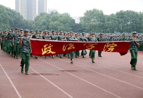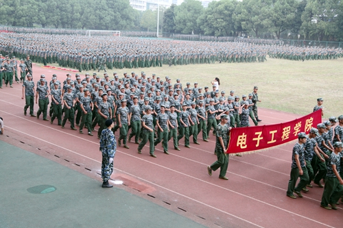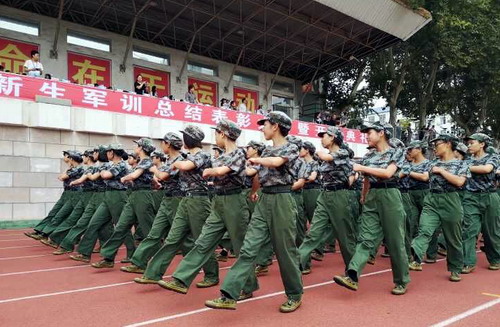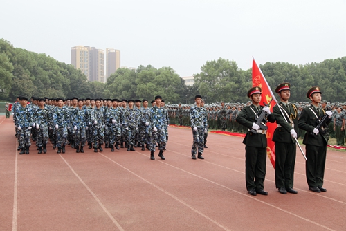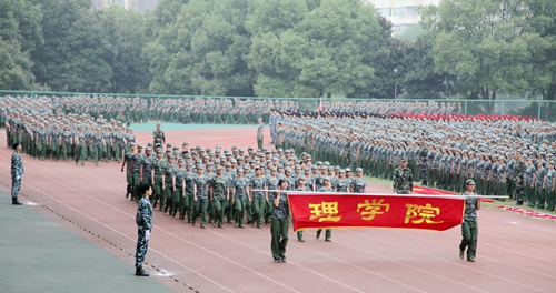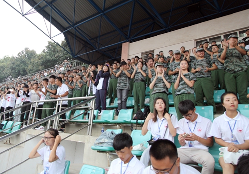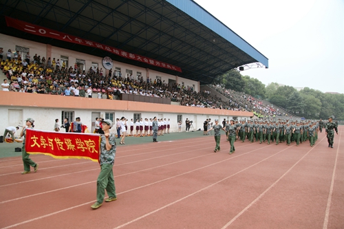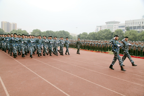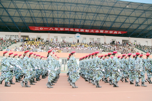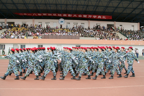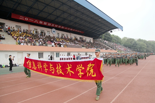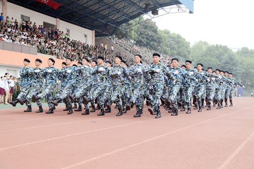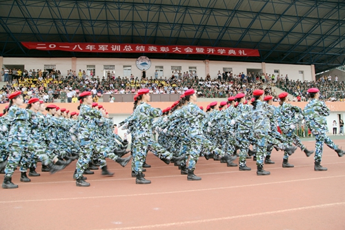 随后,男标兵连和女标兵连代表2018级新生进行了分列式表演。他们整齐的队列、洋溢朝气的面庞、规范而又标准的动作赢得了全场一阵又一阵的掌声与欢呼声。