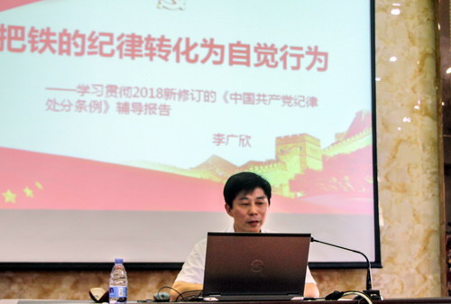 报告中,校纪委书记李广欣从“新纪律处分条例的特点、主要内容和贯彻落实新纪律处分条例的要求”等三方面为大家作了深度的解读。整个辅导报告深入浅出、通俗易懂,既有严谨的理论阐述,又有生动形象的案例说明,对大家进一步学习贯彻落实新修订的《中国共产党纪律处分条例》,培养党员领导干部自觉遵守党的纪律并转化为自觉行为有着极大的促进作用和指导意义。