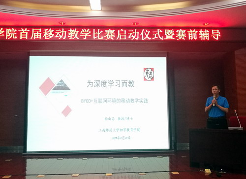 本次活动邀请了江西省高校第一届移动教学大赛特等奖获得者江西师范大学杨南昌教授作经验交流。杨教授结合自己的实际教学工作,从“为深度学习而教、课程设计思路、移动教学实践、教学效果分析和未来教学展望”等几个方面,分享了其 “BYOD+互联网环境的移动教学实践”的研究成果。