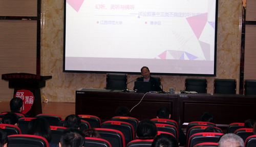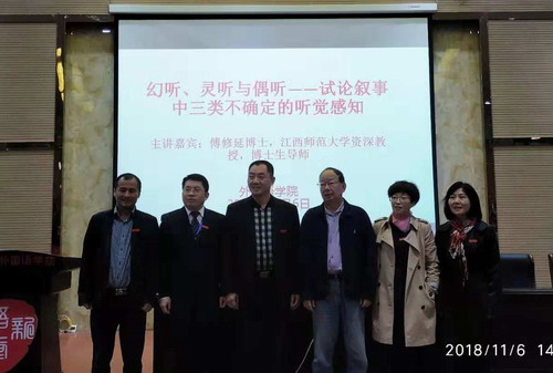 11月6日下午,江西师范大学教授、博士生导师、国家社科基金评审专家傅修延教授应邀来外国语学院作了题为《幻听、灵听与偶听——试论叙事中三类不确定的听觉感知》的学术讲座。副校长陈春生教授、外国语学院院长韩琨、党委书记杨杰、副院长罗其娟及党委副书记彭晓出席,与外国语学院教师和2016级学生共同聆听了此次讲座。讲座由外国语学院副院长周志高教授主持。