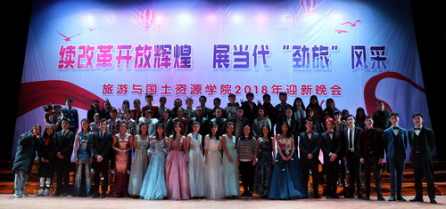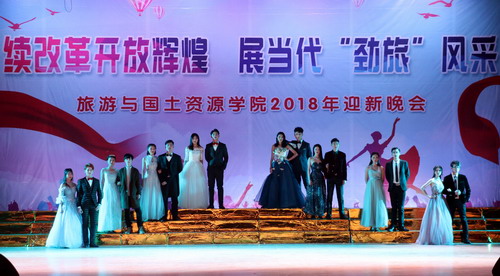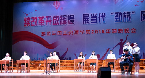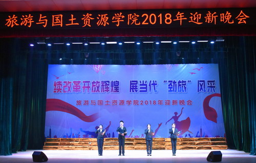 续改革开放辉煌,展当代“劲旅”风采。12月12日晚,旅游与国土资源学院在主校区大礼堂成功举办2018年迎新晚会。副校长陈春生,党委委员、宣传部长冯建,学院党政领导及全院师生观看了本场晚会。