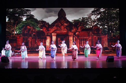 晚会在柬埔寨皇家学院的开场节目《祝福舞》中拉开序幕,表演者跳着优美的舞蹈,把金银花从天空洒下来,向观众表示着最美好的祝愿。