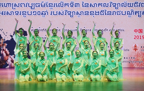 晚会上,来自柬埔寨的艺术家们和九江学院的柬埔寨留学生,为大家展现精彩绝伦的古典高棉艺术。柬埔寨皇家科学院代表团带来了《孔雀舞》、《敲椰壳舞》、《美人鱼舞》、《耕祭舞》,九江学院的柬埔寨留学生们表演了《淑女舞》、《笙舞》、《水布舞》,这些富有高棉特色的舞蹈,呈现了柬埔寨人民沟通交流、祭拜神灵、感恩自然、庆祝节日等场景。柬埔寨的艺术家演奏了四种柬埔寨传统乐器,或深沉,或细腻,或委婉的曲调,使观众感受到了浓郁的古典高棉文化气息。